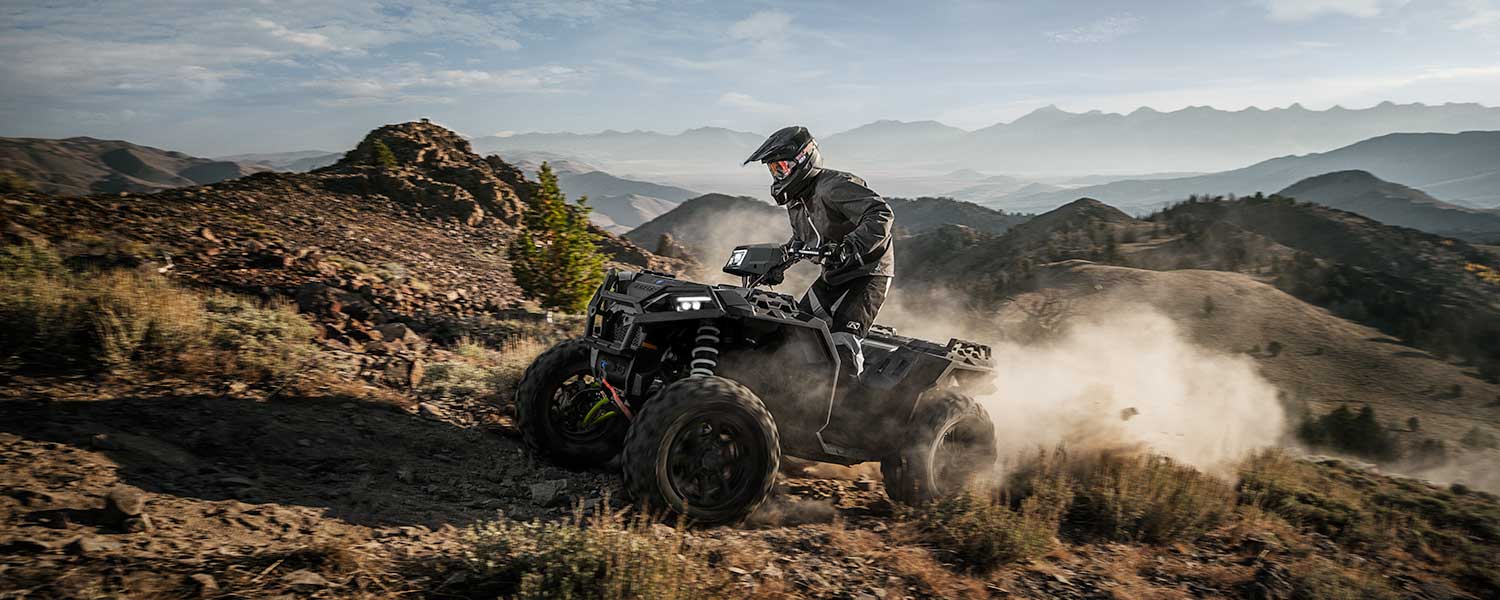 ATV steht für All-Terrain-Vehicle - auch bekannt als Quad oder Four-Wheeler - und ist ein kleiner Geländewagen mit Lenkerlenkung, Sitzbank und in der Regel für nur einen Fahrer gebaut, obwohl einige auch einen Beifahrer hinter dem Fahrer zulassen. Polaris ATVs sind in der Regel mit einem Daumengashebel ausgestattet, um die Beschleunigung bei Kurvenfahrten genauer zu steuern. ATVs können als schnelles Transportmittel über unwegsames und abwechslungsreiches Gelände verwendet werden, für den Einsatz als Zugfahrzeug oder zum Tragen schwerer Lasten und einige werden für den Freizeitgebrauch wie Rennen oder Trailriding verwendet.